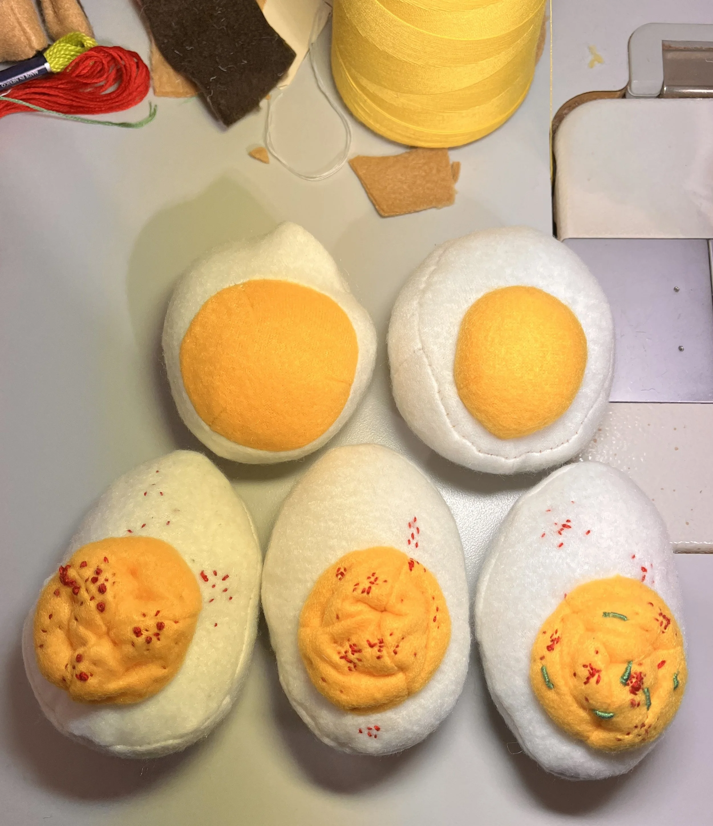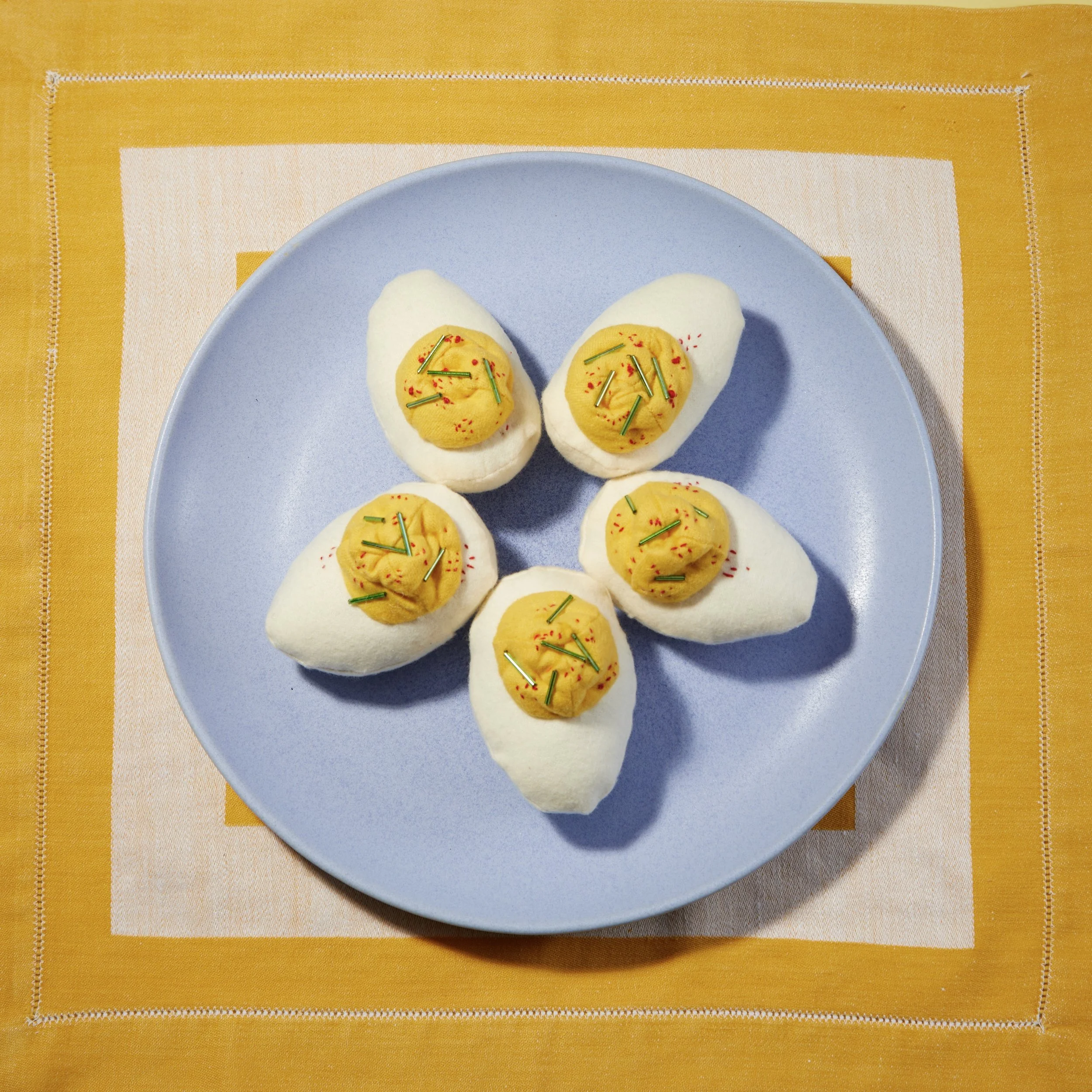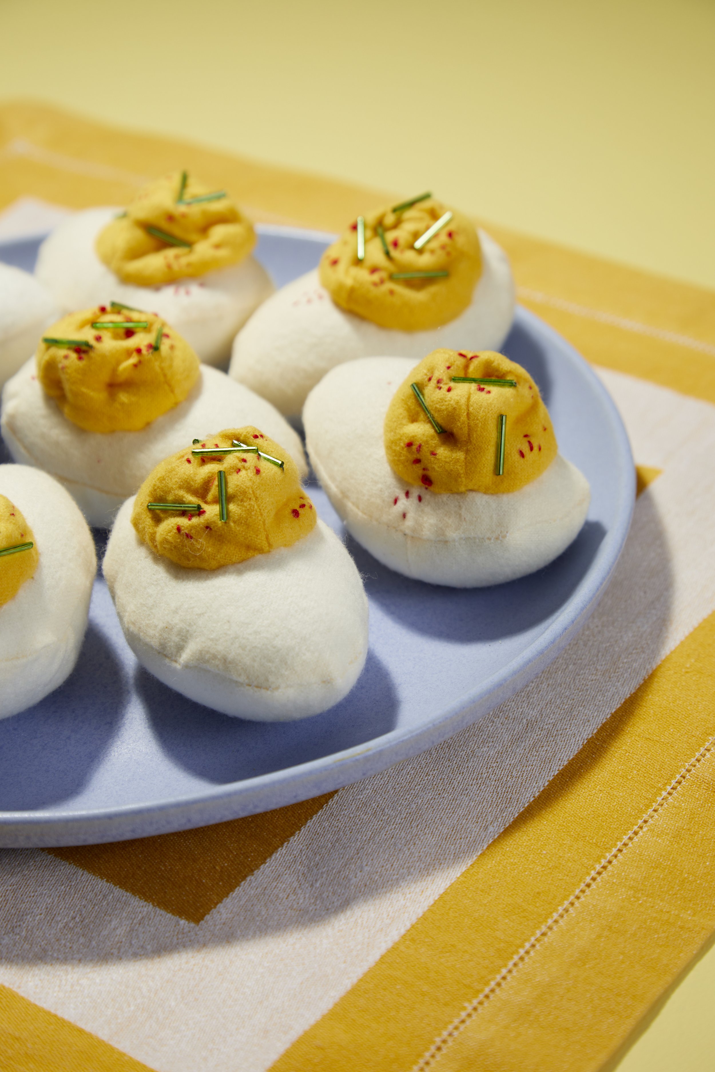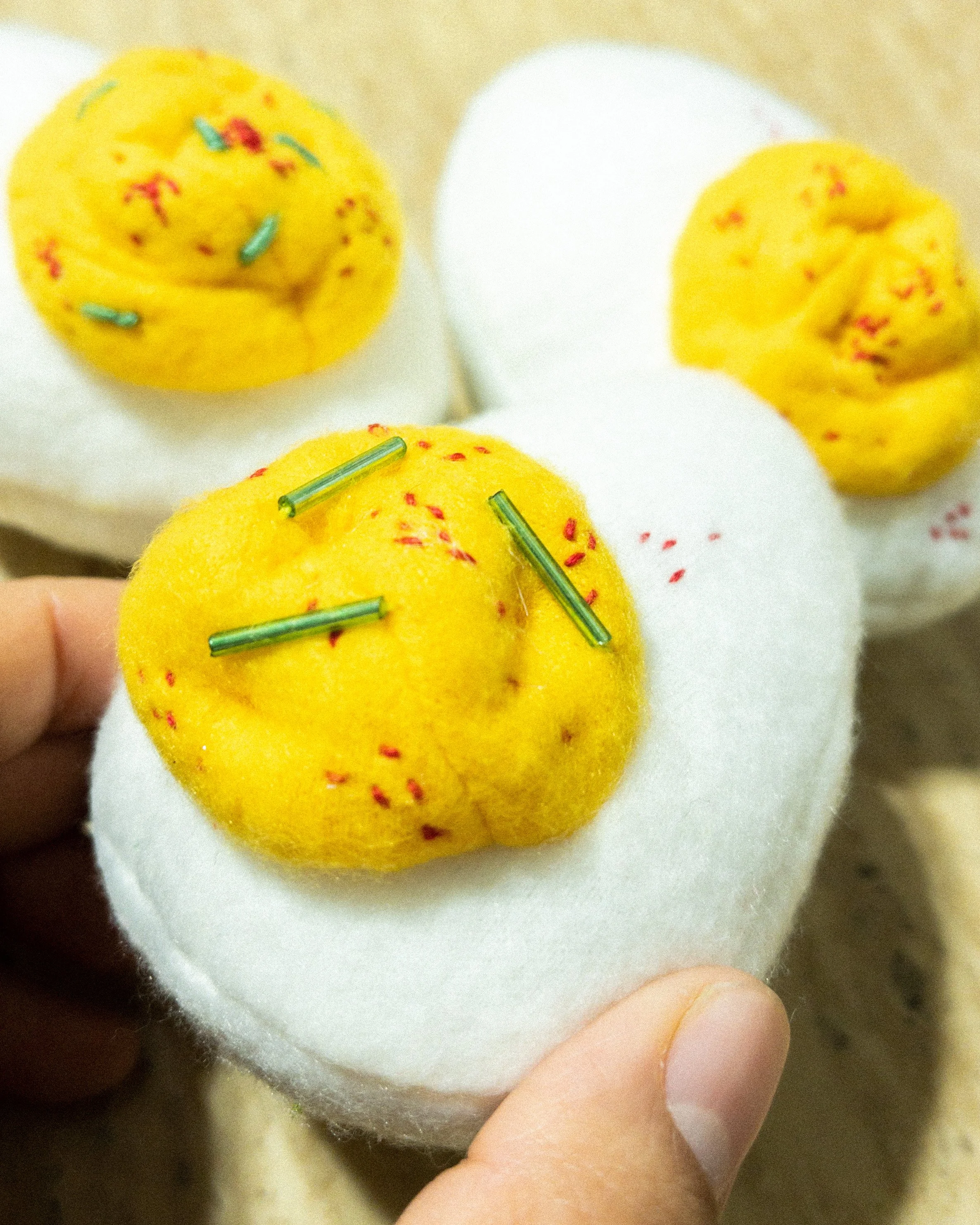 Getting the texture right required strategically placed thread sculpting to recreate the effortless, yet polished look of a dressed up yolk placed back in a boiled egg white and topped with a sprinkle of warm cayenne and paprika powders all placed with delicate stitches.